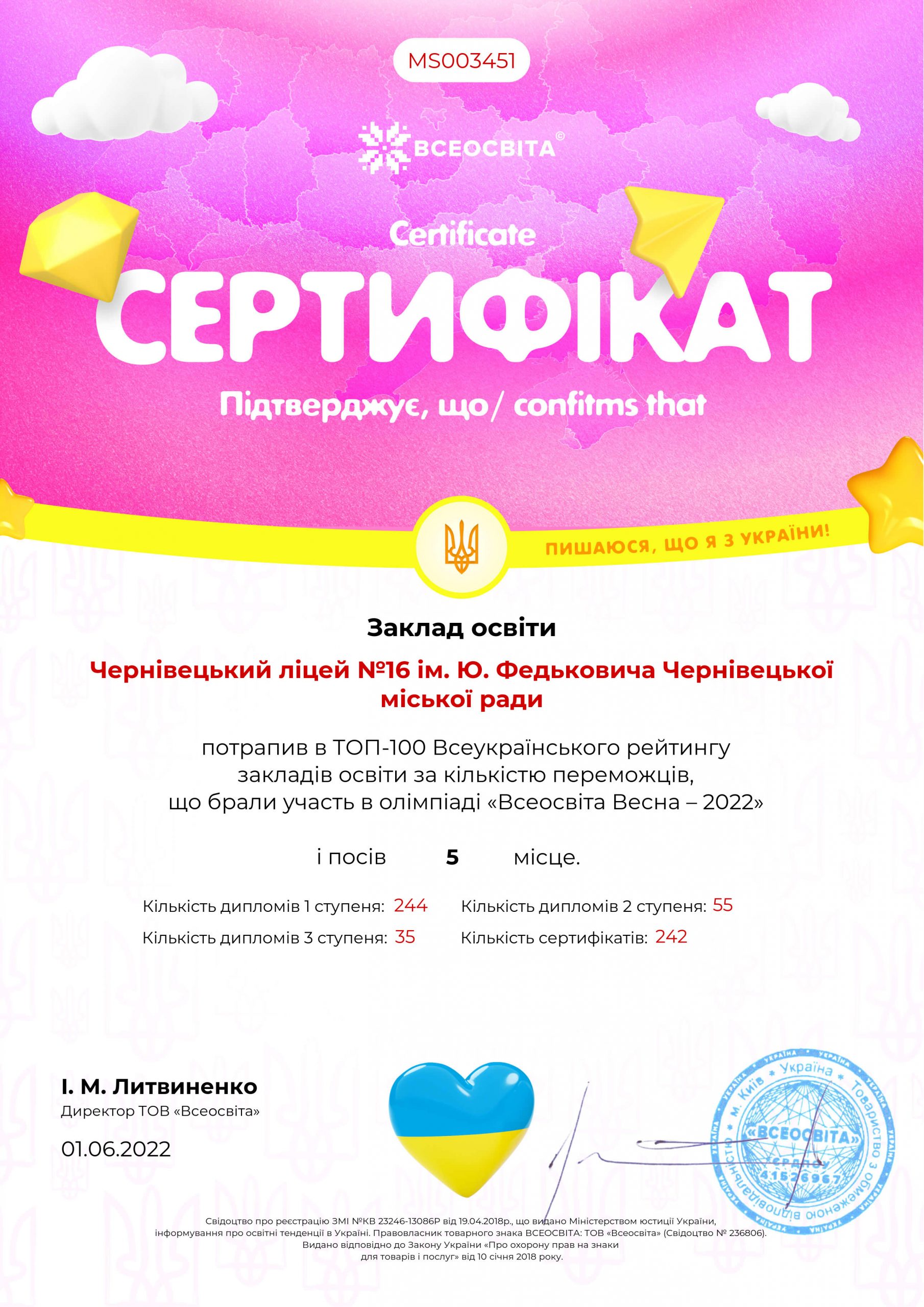• Кількість сертифікатів – 58
